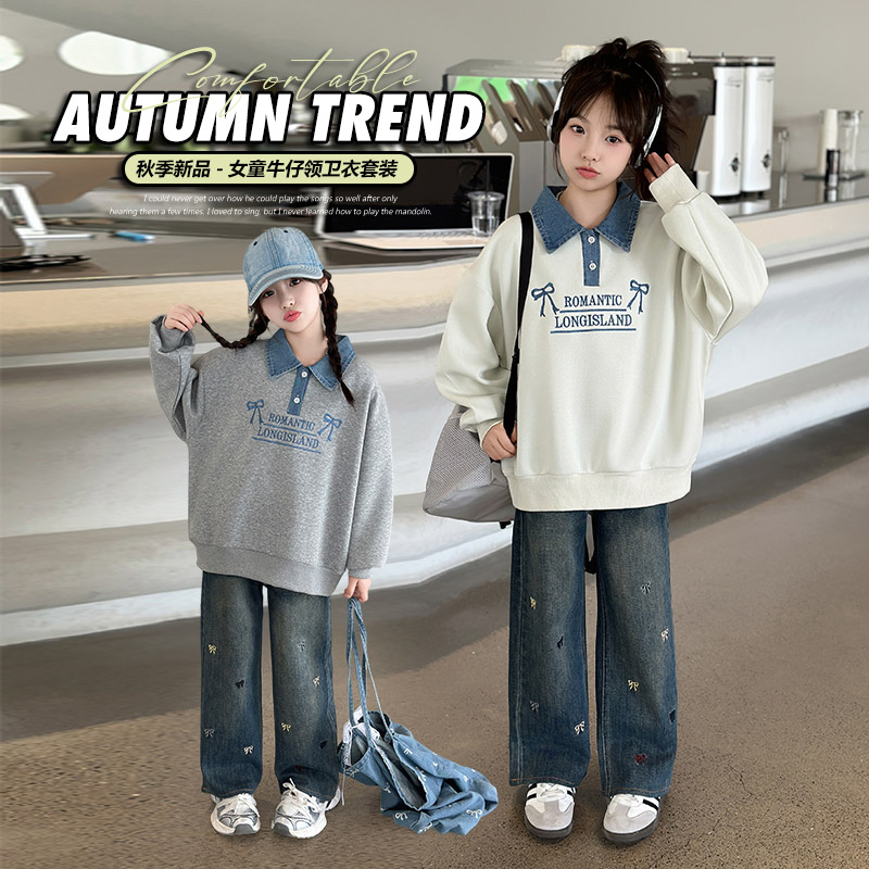 1*6收藏“小猫彩扣条纹一体绒卫衣加绒牛仔裤套装”